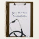 Design profissional para empresas de classe profissional para fins médicos: uma prancheta de couro castanho com papel de vazio e um estetoscópio. Perfeito para qualquer negócio relacionado à saúde e aos cuidados de saúde, como um escritório médico, consultório médico, clínica ou hospital. Para funcionarios hospitalares, médicos, enfermeiras; elegantes, nobres e elegantes.