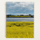 Um campo de canola amarela vibrante floresce sob um céu dinâmico, com manchas de nuvens fluffy lançando sombras na paisagem. Ao fundo, uma banda contrastante de árvores verdes escuras separa o campo de uma extensão tranquila de água. Esta imagem foi tirada perto de Streatham em Victoria, Austrália.