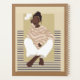 Uma mulher senta-se num suéter listrado e calças brancas com margaridas.