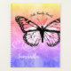 Brilhe seu dia com essas delicadas borboletas monarcas flutuando através deste planejador monograma. Este design apresenta uma ilustração preta de uma borboleta monarca com salpicos brancos e sopros brancos num fundo arco-íris de amarelo, rosa, azul e roxo. Acima da borboleta em um roteiro moderno que diz "Fé, Família, Amigos". À esquerda da borboleta está seu nome na tipografia branca que pode ser personalizada. Nas costas estão três borboletas graciosas. Faz o presente perfeito para a natureza e amantes de borboletas. Projetado pelo famoso artista mundial Tim Coffey.