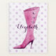Moda Stiletto - imagem com estilo aquarela de um moderno joelho roxo rosa alto, estiletto, para salto, embelezado com 3 botões, assentada em bolinhas roxas e mauvas. Use a modelo para personalizar com seu nome ou mensagem na fonte de script roxo do berbequim.