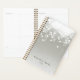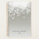 Planeador com coluna dourada apresenta a típica inscrição negra em um fundo de cinza prateada adornada com uma explosão de luzes brancas de um livro no topo. Personalize com duas linhas de texto personalizado, fazer este planejador como uma escolha perfeita para negócios, compromissos ou tarefas diárias.