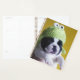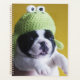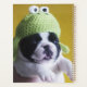 Um cachorrinho francês com um chapéu de crochê sapo.
