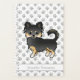 A ilustração original do desenho animado de Destei de um cão da raça casaco Chihuahua, preto e alto. Há também uma área de texto personalizável para um nome ou título. O fundo tem um padrão de cinza leve de estampas de pata de cachorro.