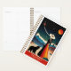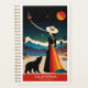 Descubra o fascínio da "Califórnia: A Terra dos Sonhos" com este design de planificador atordoante!, Nesta cena encantadora, uma mulher com um vestido vibrante e um chapéu largo que fica ao lado de um urso, ambas olhando para um céu noturno que respira adornado de planetas e estrelas. O pano de fundo apresenta montanhas majestosas com capas de neve e palmeiras balançando, incorporando perfeitamente a beleza diversa da Califórnia. Acima desse quadro branco, a frase "Califórnia: A Terra dos Sonhos" captura a magia e a aventura que se espera no Estado Ouro. Transforme seus sonhos de viagem em realidade com esse planejador de viagem.