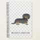 A ilustração original do desenho de Destei de um lindo cão da raça Dachshund, preto e casaco bronzeado. O fundo tem um padrão de pegadas de cinza. Há também uma área de texto personalizável.