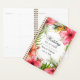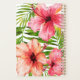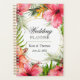 Caderno de planejamento de casamento com flores de hibisco de ilha tropical e folhas de palmeira com anéis de ouro que enquadram seus nomes e data de casamento.