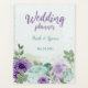 flores roxas românticas e azuis com algumas folhas verdes planejador de casamento botânico.