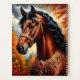 Uma representação espantosa de um cavalo nobre adornado com decorações intrincadas de ouro e joias, colocada contra o pano de fundo vibrante de uma floresta de outono, com cores ousadas e beleza natural cativante.