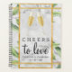 Esta design de Cheers to Love apresenta dois vidros de champanhe em um brinde para amar por um casamento ou aniversário de casamento. Este elegante planejador de casamento e organizador apresenta um design com belos antecedentes de mármore branco complementa um quadro de ouro com sotaques botânicos. Personalize este item com os seus nomes e a data do evento.