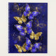 Composição de borboletas luxuosas de safira e joias de ouro em fundo azul texturizado.