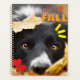 Una agenda con una imagen de un perro jugando o acostado entre hojas con texto en inglés "hello FALL"