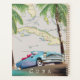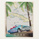 Mapa ilustrado de Cuba (além das ilhas circundantes) em um belo estilo vintage detalhado com um carro cubano clássico no pôr do sol.