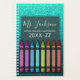 O brilho azul-turquesa brilha por trás de um conjunto de lápis coloridos dispostos em um padrão arco-íris. Atualize facilmente o nome do professor, a escola e o ano. O 'chalkboard' e as fontes são usados para imitar a sala de aula de um professor. Disponível em muitas outras cores brilhantes.