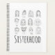 Documento de ilustração de rabiscos do feminismo da Irmandade com diversos retratos femininos em destaque na arte. Um caderno feminista desenhado a preto e branco com tinta caneta. Um caderno de desenho linear do feminismo exclusivo com personagens de desenho animados femininas. Este caderno de igualdade é único e artístico e é uma adição perfeita ao seu presente: amigo, namorada, irmã, mãe, tia, prima e sobrinha. Obtenha um notebook único para a igualdade do feminismo hoje mesmo!