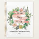 Este planejador de casamento apresenta uma coroa de cacto decorativa com um cacto de pera picante, uma flor rosa. No centro, diz "feliz para sempre" em uma fonte de serifa negra. Você pode personalizar com seus nomes e ano. As cores incluem verde, rosa, branco e preto.