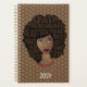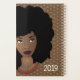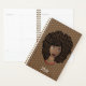 Esta design apresenta "Rainha, fenomenal, bela, inteligente, mágica, chefe, amorosa, sexy, independente, engraçada, criativa e forte" aninhada na afro, com colares coloridos em camadas sobre um fundo de bolinhas retangular.