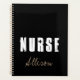 Mantenha seus dias e agendamento organizados com este Enfermeiro Preto e Dourado Na moda Personalizado Planejador. Este design moderno tem um fundo preto personalizável em ambos os lados. A frente tem o texto "enfermeira" em letras grandes e brancas angustiadas, seguido do nome no falso roteiro dourado que marca a letra da mão na área inferior. Clique na opção personalizar modelo e siga o prompt.