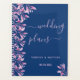 Um planejador floral elegante e moderno para o seu casamento. Personalize e adicione seus nomes e data. O texto: Planos de Casamento é escrito com uma grande escrita à mão com letras maiúsculas e minúsculas. Texto rosa. Fundo azul decorado com prigos botânicos e folhagem cor-de-rosa.