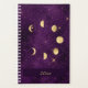 O planejador diário celestial atrativo apresenta as fases da lua dourada ilustração circular sobre o fundo do céu noturno roxo estrelado de galáxia. Personalizar com ano, nome ou outra mensagem especial.