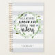 Nosso planejador de motivação quic mostra a citação "mulheres bem comportadas raramente fazem história" em um roteiro de pincel mantilado rodeado por uma coroa botânica em azul e verde em um fundo listrado de cinza neutra. Personalize com o ano e seu nome, ou sua escolha de personalização.