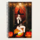 "Pumpkin Throne Witch" Uma feiticeira de cabelos vermelhos rodeada senta-se sobre um jack-o-lanterno brilhante, enquadrado por uma janela gótica e arcaica e um estranho e encantado pano de fundo da floresta. Com abóboras brilhantes nos seus pés e um olhar travesso, ela traz glamour escuro para a noite de Halloween.
