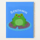 Este sapo verde giro e feliz sentado em uma almofada de lírio roxa é brilhante e adorável. Muita diversão anfíbia desenhada no estilo de animação feliz.