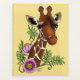 Retrato de uma girafa fofa contra um pano de fundo amarelo com flores cor-de-rosa.
