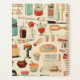 Bolos bonitos, taças de vidro e ferramentas de cozinha. Cores principais: azul-bebê, vermelho e pastel.