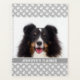 Modelo personalizável de foto de animal de estimação em uma cor de fundo de uma cinza que tem um padrão de impressões de pata de cão branco. Há também uma área de texto personalizável sob a foto para seu texto personalizado.