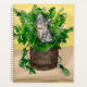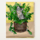 Gato cinza puxado pela mão sentado num pote de catnip.