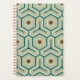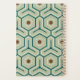 Geometric pattern with interlocking hexagons in green and teal, featuring brown hexagons in the center. The design is symmetrical and retro-inspired.