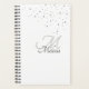O elegante planejador da Srta. Monograma apresenta um monograma de prata falso gravado e seu nome na tipografia moderna. O design feminino preto, prateado e branco é acentuado com uma cascata de falso confete prateado e colocado sobre um fundo branco nítido. #Planejador #Monograma