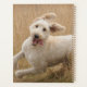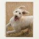 Goldendoodle, língua para fora, orelhas a flutuar, corre através da grama alta.