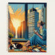 Bonito mulher do estilo pop de arte do quadrinho sentada em uma janela da cidade segurando uma xícara de café olhando pelos arranha-céus da cidade enquanto o sol nasce enquanto seu gato dorme perto dela.