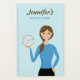 A ilustração de desenho de Destei de uma garota fofa que está segurando uma bola de vôlei em sua mão. A menina tem cabelo castanho longo e está vestindo uma camisa azul. A cor de fundo é azul claro. No topo, há áreas de texto personalizáveis para o título do planejador.