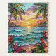 Pretty seaside coastal planner with a gorgeous ai impasto oil painting style illustration of blue ocean waves crashing on a sandy beach, that is covered in sea glass and surrounded by palm trees at sunset and sunrise.