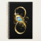 Símbolo Dourado e brilhante do infinito, decorado com pena de joalharia de pavão com turquesa sobre fundo preto.