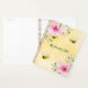 Fundo amarelo, branco com um padrão de mel. Decorado com flores tropicais cor-de-rosa, hibisco e abelhinhas felizes. O texto: Meu Jardim 2021 (ou qualquer ano)
