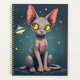This playful cartoon illustration features a hairless Sphynx cat with wide yellow eyes and a curious judging expression, set in a whimsical space scene. The gray body with pink accents contrasts beautifully against a dark teal starry sky, while a small UFO adds a fun extraterrestrial touch. Clean lines, flat colors, and a friendly sci-fi vibe make this design perfect for Sphynx cat lovers who enjoy space humor and quirky cartoon art.