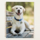 Um cão Labrador Amarelo que sorri enquanto se coloca em um banco de madeira ao ar livre em um dia ensolarado.