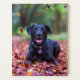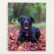 Um labrador negro que se deita entre folhas autóctones castanhas, amarelas e laranja, com folhas caindo pelo ar