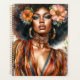 Este planejador colorido apresenta uma ilustração aquática vibrante de uma linda mulher negra com uma afro dolorosa vestindo a moda vintage dos anos 70. Ela tem flores em seu cabelo grosso e veste brincos grandes de forro de ouro e um intricado choker. Trabalho de arte de estilo retrorreflector floral de uma beleza afro-americana rica em melanina ou de outra diáspora. Perfeito para fãs de olhares ousados e orgulho cultural afrocêntrico.