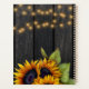Planeador de casamento russo de girassol apresentando cordas de luzes cintilantes e grandes girassóis sobre um fundo escuro de madeira marrom. Pode ser um belo presente de chá de panela para a noiva.