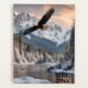 Uma águia majestosa voa sobre um rio no alto do país, à medida que a neve mantinha a terra e as árvores. Perfeito para quem ama a natureza e o exterior.