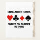 Mostre sua ponte tortuosa/senso de humor de ponte duplicado com este planejador com os quatro trajes de cartas junto com o ditado "Unbalanceed Hands Forces My Partner To Think" (Mãos Desequilibradas Que Meu Parceiro Pensa). Faça com que outros façam uma dupla tomada de como você joga e joga mãos desequilibradas com esta ponte dizendo planejador hoje!