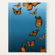 Uma variedade de borboletas preto, laranja e branco de monarca, todas num pano de fundo de ombre azul