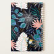 Personalize esse planejador com seu nome em itálico preto enquadrado por um retângulo branco, em um padrão botânico ousado de folhagem tropical em tons de rosa-pincel, azul e verde sobre fundo preto.