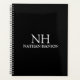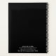 Planejador de negócios moderno com um design preto simples e mínimo com seu monograma em uma fonte em negrito junto com seu nome na frente. As costas têm as suas informações de contato.