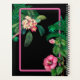 Uma moderna, mas retrorada, botânica tropical rosa-néon em fundo negro. Um belo design ideal para o verão. Design de plantas tropicais, cor-de-rosa, néon perfeito, com palmeiras, flores de Hibiscus cor-de-rosa e flores de Plumerias Frangipanis. As cores pretas, cor-de-rosa e verde dominam este design de neon rosa tropical.